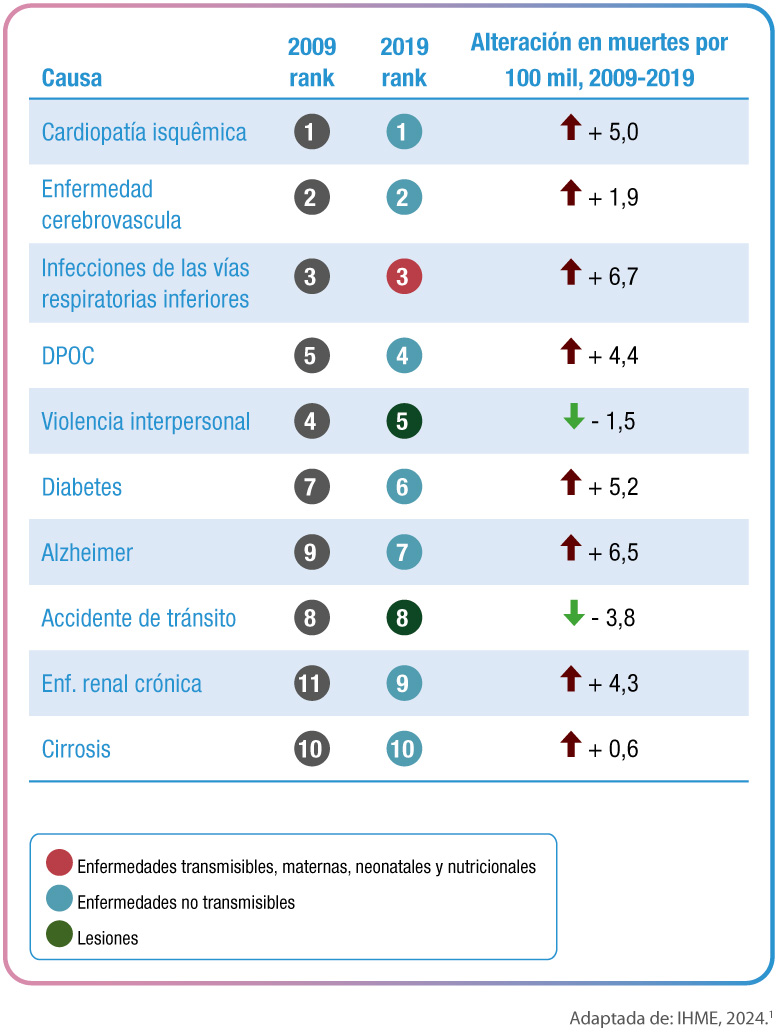 Datos del Institute for Health Metrics and Evaluation llaman la atención sobre las principales causas de muerte en Brasil.1 Según estos datos, en 2019 la principal causa de muerte en Brasil siguió siendo la cardiopatía isquémica, seguida de las enfermedades cerebrovasculares y las infecciones respiratorias (Figura1).1