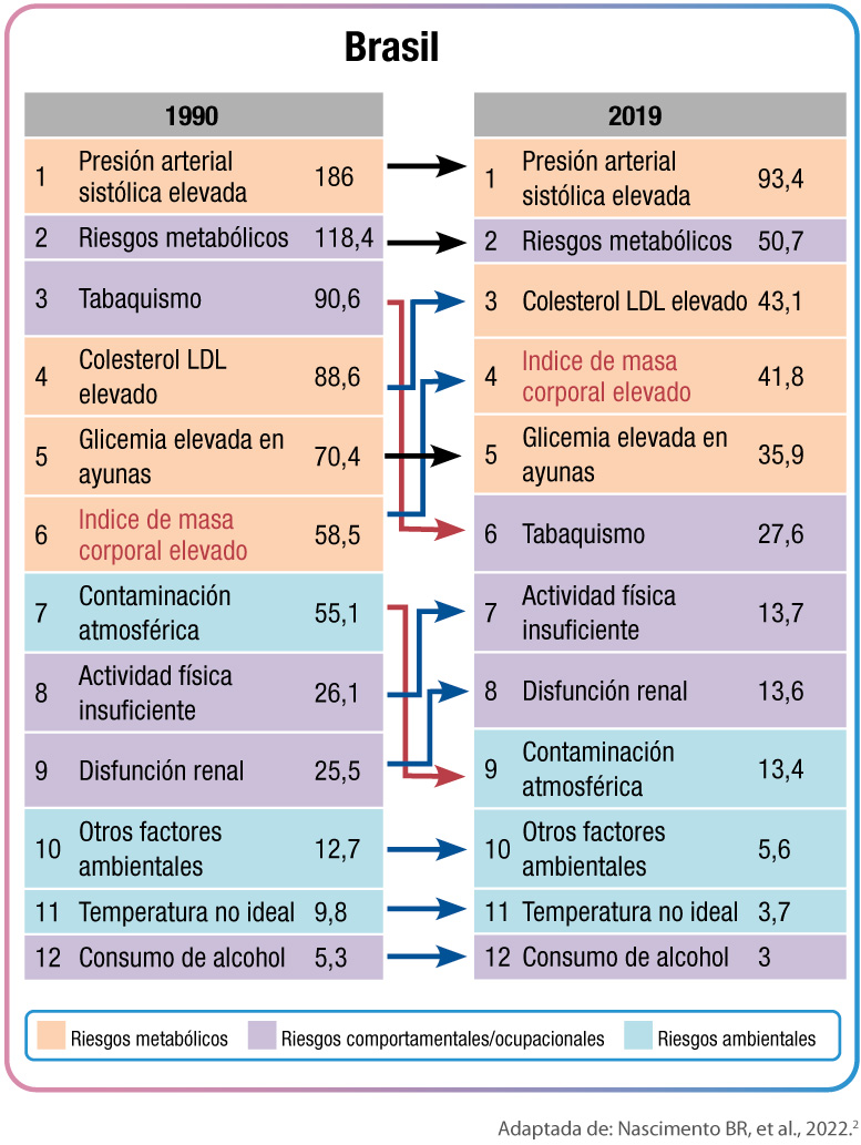 El análisis del estudio Global Burden of Disease (2019), permitió evaluar los cambios en los factores de riesgo (FR) atribuidos a la morbilidad y mortalidad por enfermedades cardiovasculares (ECV) (Figura 2).2