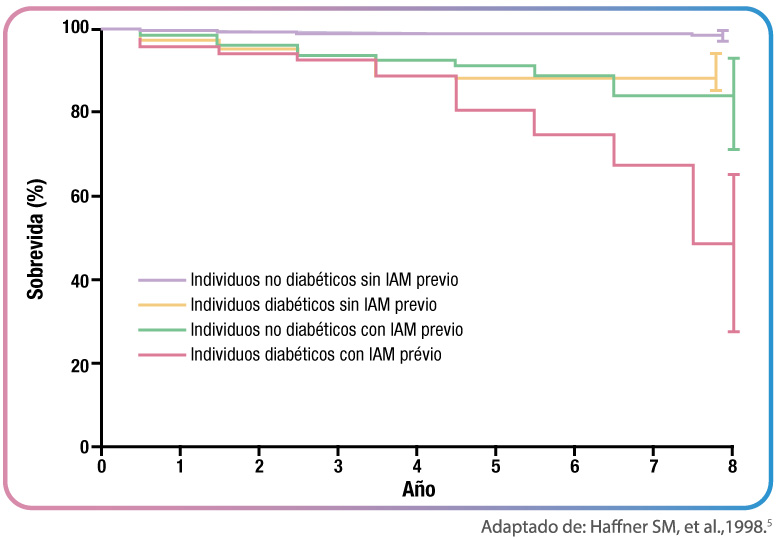 Figura 4. Estimaciones de Kaplan-Meier de la probabilidad de muerte por enfermedad coronaria en 1.059 individuos con diabetes tipo 2 y 1.378 individuos no diabéticos con y sin infarto de miocardio previo.