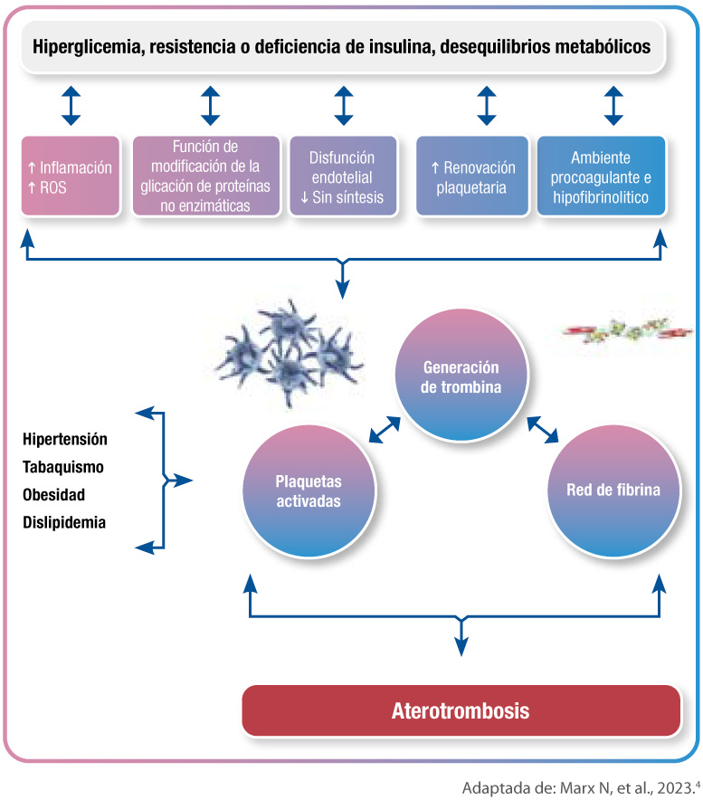 En vista de todo ello, es necesario considerar la diabetes, y más concretamente la lucha contra la hiperglicemia, como un objetivo a alcanzar para reducir el riesgo de ECV. Se sabe que la hiperglicemia conduce a la formación de especies reactivas del oxígeno (ROS), al aumento de la inflamación, a la glicación no enzimática de las proteínas modificando sus funciones y también a la disfunción endotelial con una disminución del óxido nítrico y un aumento de los factores protrombóticos, lo que hace que la placa aterosclerótica de los pacientes diabéticos sea más trombogénica (Figura 3).4