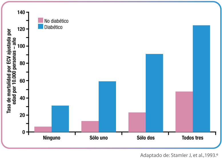 Figura 5. Tasas de mortalidad por ECV ajustadas por edad según el número de FR en hombres sometidos al cribado MRFIT (Multiple Risk Factor Intervention Trial), con y sin diabetes al inicio del estudio.