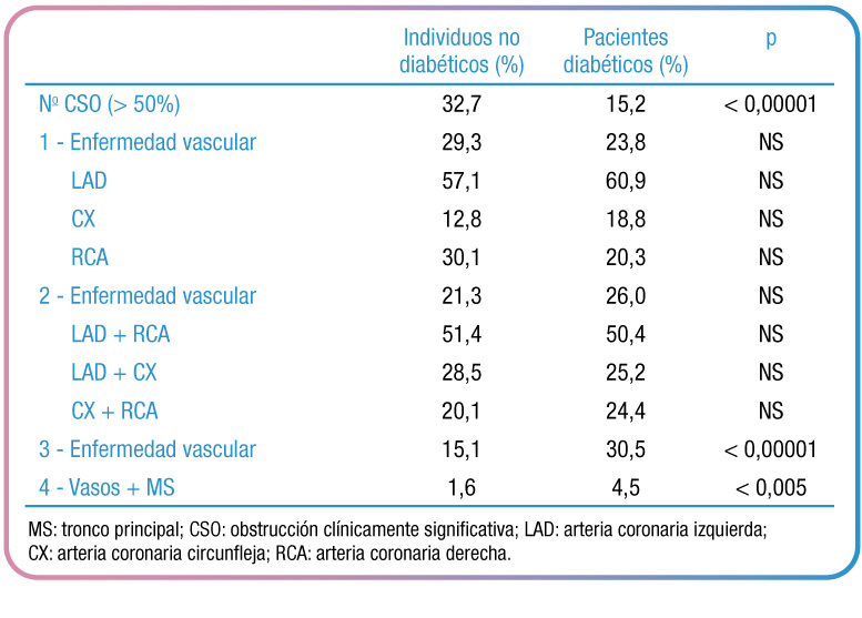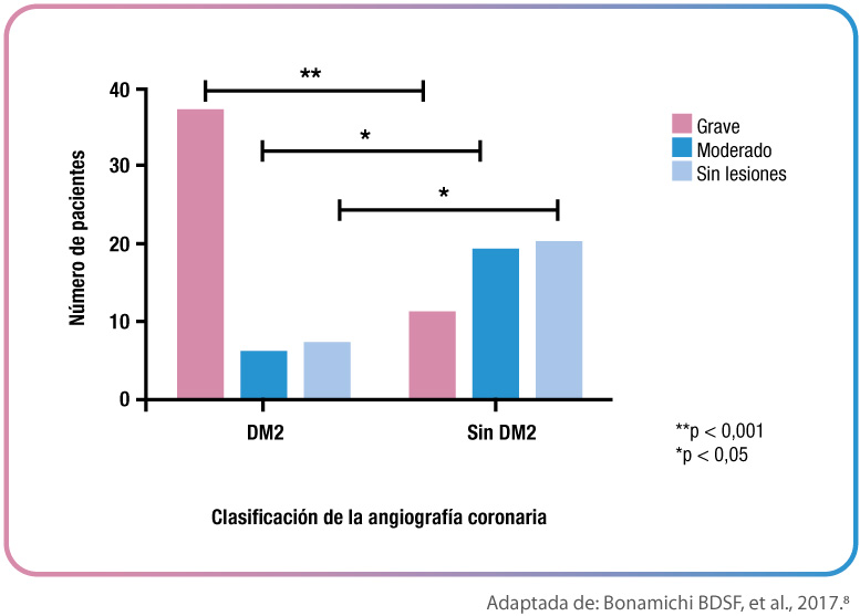 Haffner et al. publicaron un artículo en The New England Jornal of Medicine en el que sugerían que los pacientes con DM2 y sin infarto previo tenían una tasa de sobrevida similar a la de los pacientes sin DM pero que ya habían sufrido un infarto (Figura 4).5 Stamler et al. también demostraron que los pacientes con diabetes tenían un mayor riesgo de sufrir eventos CV que los que no padecían diabetes, y con cada adición de un nuevo FR la probabilidad aumentaba aún más (Figura 5).6 Además, se sabe que los pacientes diabéticos tienen lesiones intracoronarias más graves que generalmente afectan a más de un vaso al mismo tiempo (Figuras 6 y 7).7,8 Un estudio de la Facultad de Medicina de la Santa Casa de São Paulo mostró que los pacientes con síndrome metabólico (SM) y DM2 presentaban lesiones coronarias más graves en la ecografía intravascular que los que sólo tenían SM. Este hallazgo sugiere que, además de la resistencia a la insulina presente en el SM, la hiperglicemia puede desempeñar un papel en el desarrollo de la enfermedad aterosclerótica.8
