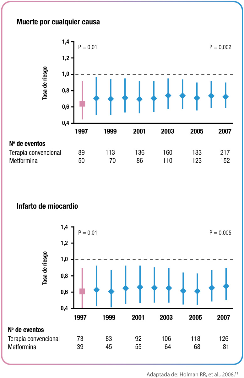 Figura 8. Reducción del riesgo de muerte por cualquier causa y de IM en los grupos de control intensivo.