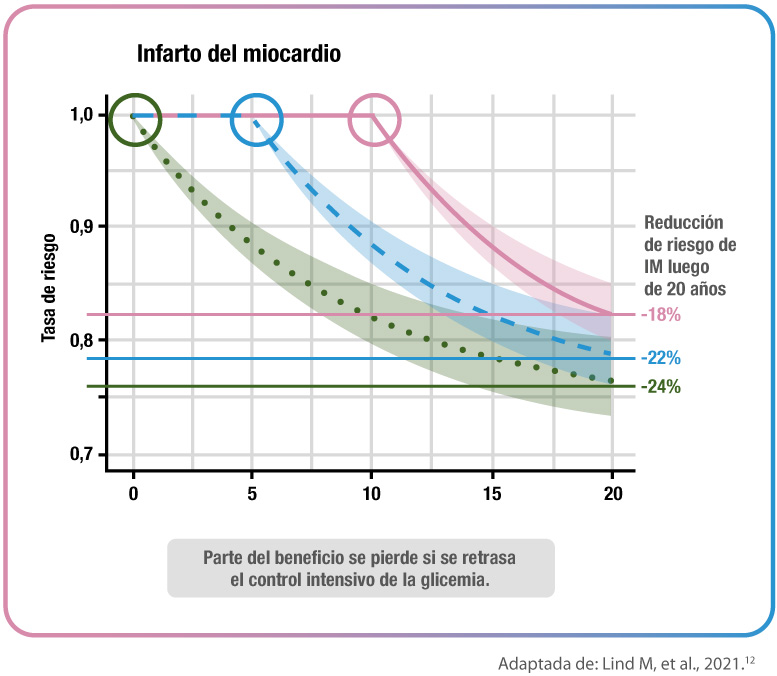 Figura 9. Reducción del riesgo de IM con un control intensivo de la glicemia y pérdida de beneficios cuando se retrasa el inicio del tratamiento intensivo.
