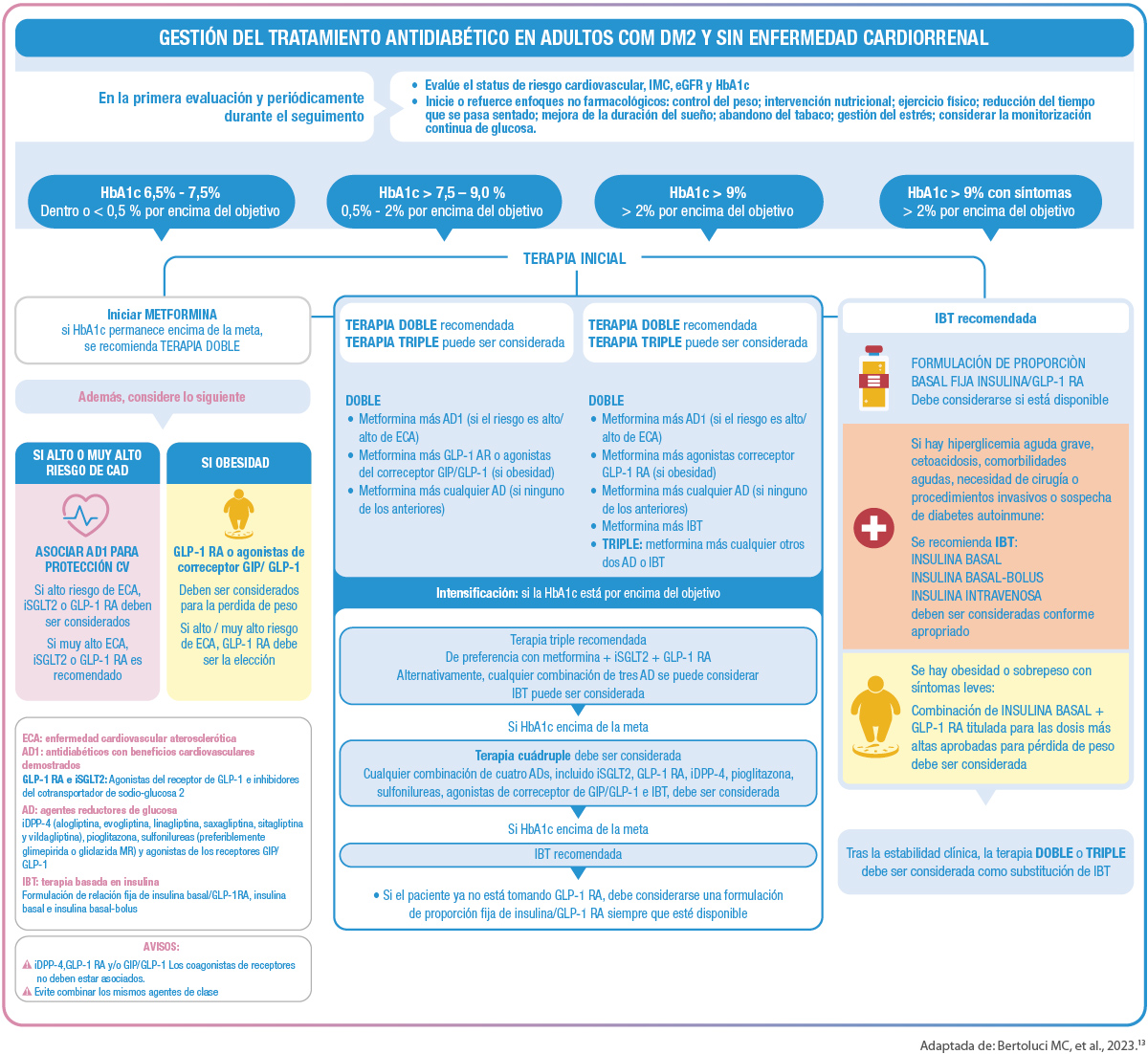 Para elegir el mejor tratamiento para la DM2, es necesario tener en cuenta no sólo el efecto de los fármacos en la reducción de la glicemia, sino también en los beneficios adicionales que pueden ofrecer, como protección cardíaca y renal, y los efectos secundarios que pueden causar, como hipoglicemia y aumento de peso. Las directrices brasileñas de 202313 recomiendan individualizar el tratamiento según el perfil clínico de cada paciente, teniendo en cuenta el riesgo CV, presencia de enfermedad renal, obesidad, edad y el costo de los fármacos. La metformina está indicada como tratamiento inicial para la mayoría de los pacientes, excepto en casos de contraindicación o intolerancia.