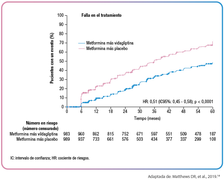 El estudio VERIFY14 demostró que la combinación de un inhibidor de dipeptidil peptidasa-4 (iDPP-4) con tratamiento con metformina presentaba un menor riesgo relativo de tiempo hasta el fracaso inicial de tratamiento en comparación con el grupo de metformina sola (Figura 11).14
