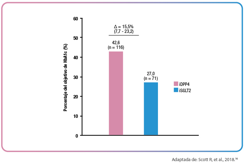 El estudio CompoSIT-R descubrió que la eficacia del control glicémico de iSGLT2 se reduce en pacientes con insuficiencia renal crónica (IRC) moderada y está contraindicado en casos de IRC grave.16 Este estudio mostró un control glicémico superior en el grupo que utilizó metformina-sulfonilurea e iDPP-4 versus el grupo que utilizó metformina-sulfonilurea e iSGLT2 (Figura 12).16