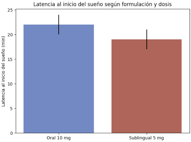 Gráfica 1. Latencia al inicio del sueño (minutos) según formulación y dosis. La gráfica muestra que tanto la formulación oral de 10 mg como la sublingual de 5 mg logran una latencia al sueño similar, con una ligera ventaja para la sublingual en pacientes con insomnio de conciliación (de Sousa Maia et al., 2024).