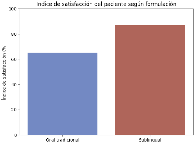 Gráfica 2. Índice de satisfacción del paciente según formulación. Los pacientes tratados con zolpidem sublingual reportan niveles de satisfacción superiores al 85%, en comparación con el 65% observado en la formulación oral tradicional (Afilhado et al., 2024).