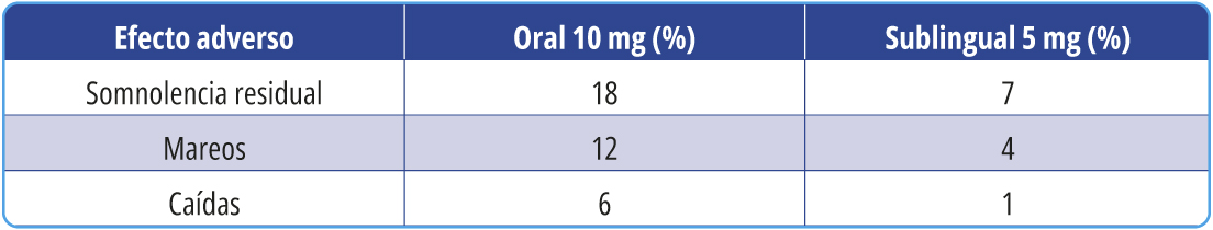 Diversos estudios clínicos recientes han evidenciado que el zolpidem sublingual, administrado a dosis de 5 mg, es igual de eficaz que la formulación oral de 10 mg para la inducción del sueño, pero con una reducción significativa en la incidencia de somnolencia residual, mareos y caídas (Afilhado et al., 2024; de Sousa Maia et al., 2024). Esta característica resulta especialmente relevante en el manejo del insomnio de conciliación y de los despertares nocturnos, donde la necesidad de un inicio de acción rápido y una corta vida media es fundamental para evitar efectos adversos matutinos (Yang et al., 2012; Dang, 2010).